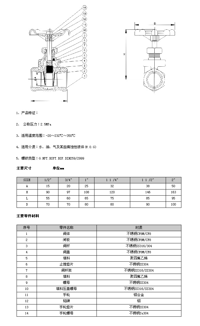 零件名稱 | 閥體、閥蓋 | 閘板、閥座、閥桿 | 填料 | 閥桿螺母 | 手輪 |